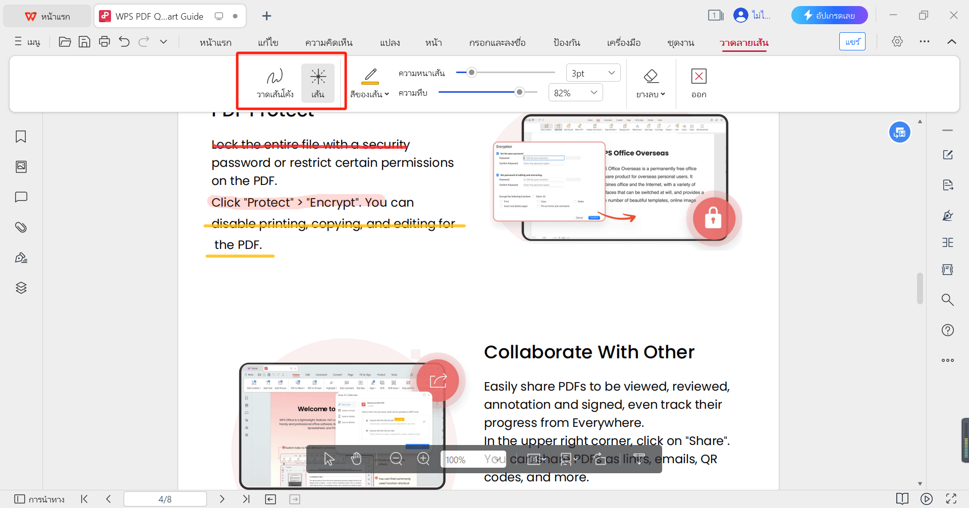 เครื่องมือสุดท้ายคือเครื่องมือวาดเพื่อเน้นข้อความใน WPS PDF มันรู้สึกเหมือนกับการเน้นข้อความในหนังสือของเรา - ด้วยการวาดอิสระ มีตัวเลือกสีที่แตกต่างกัน มาดูวิธีการเน้น PDF ใน WPS Office โดยใช้เครื่องมือวาดและวิธีการเปลี่ยนสีเน้นของเครื่องมือวาดใน WPS PDF