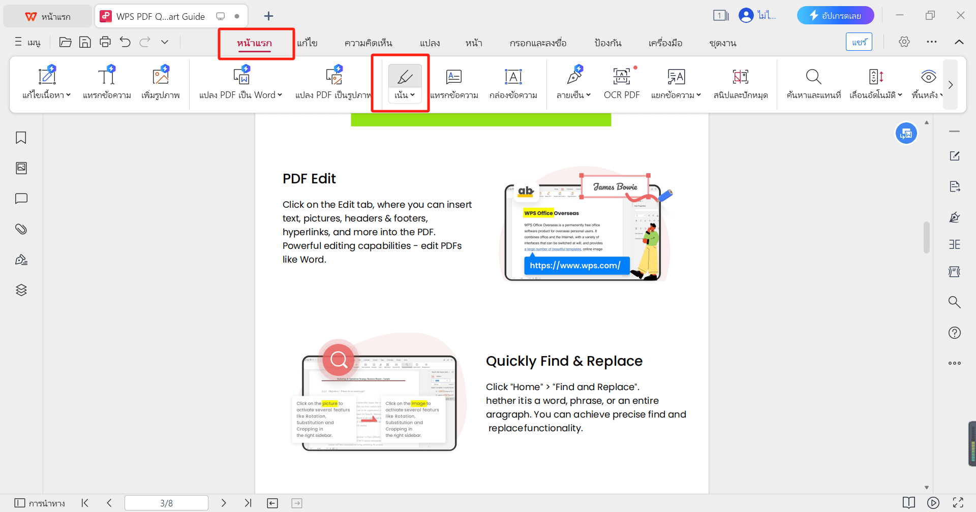 ขั้นตอนที่ 1: เครื่องมือเน้นใน WPS PDF สามารถเข้าถึงได้ในแท็บหน้าแรก คลิกที่ปุ่มเน้นเพื่อเปิดใช้งาน