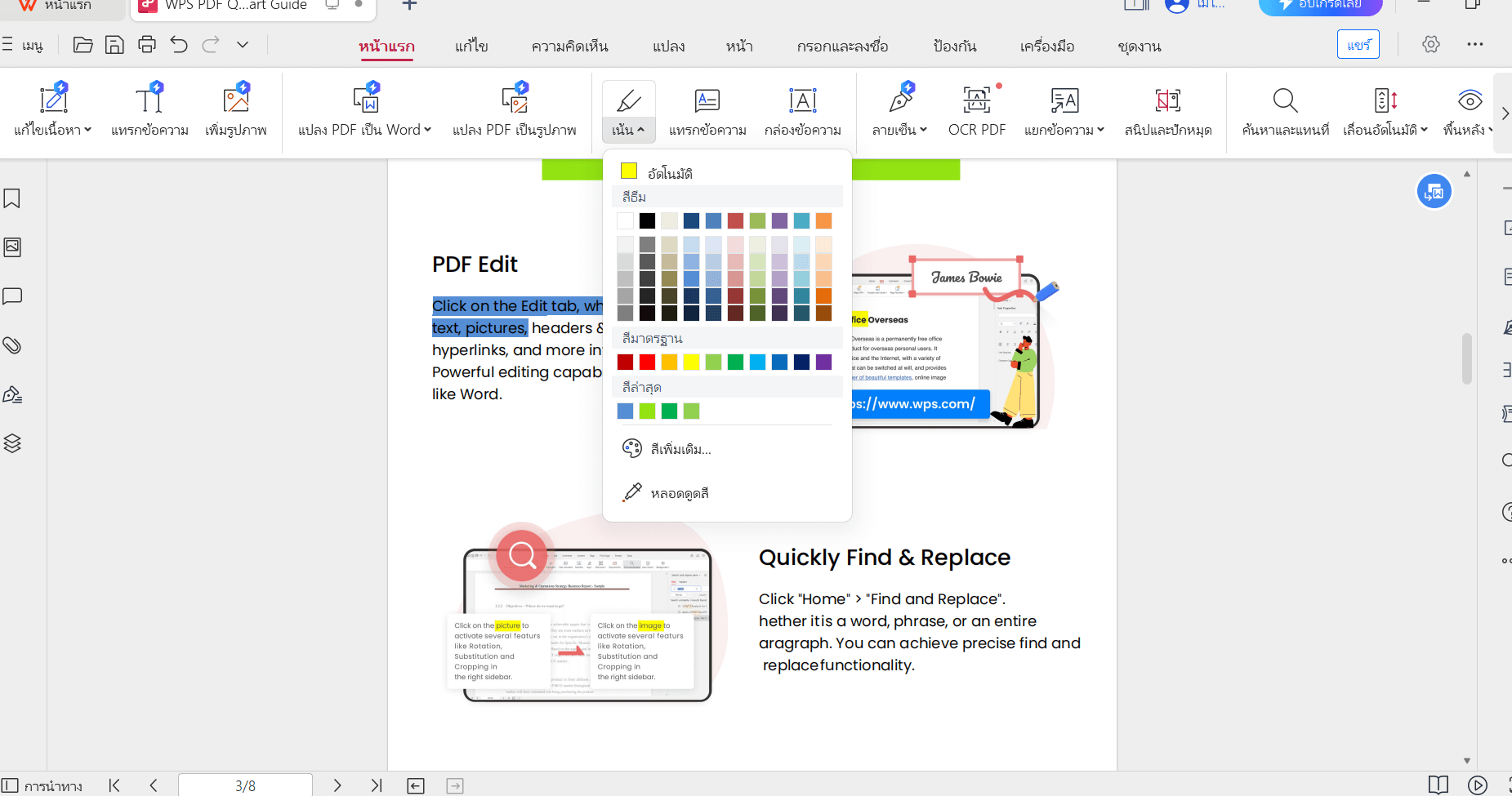 ขั้นตอนที่ 3: หากคุณไม่ชอบสีเน้นหรือต้องการใช้สีที่แตกต่างกันสำหรับส่วนที่ต้องการ แค่คลิกที่ปุ่ม "เน้น" เพื่อขยายและดูสีที่มีให้เลือกใน WPS PDF