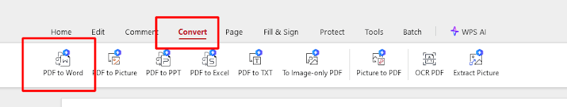 ขั้นตอนที่ 3: แปลง PDF เป็น Word: PDF ที่เปิดอยู่จะต้องแปลงเป็นรูปแบบ Word DOCX โดยใช้ตัวเลือก "แปลง" ใน WPS Office